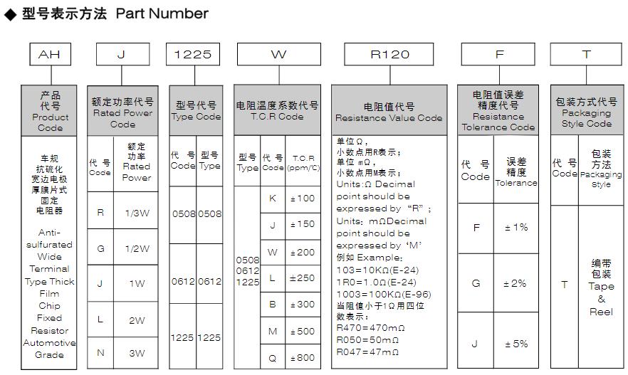 風(fēng)華高科車(chē)規(guī)抗硫化寬邊電極厚膜片式固定電阻器型號(hào)命名規(guī)則:
