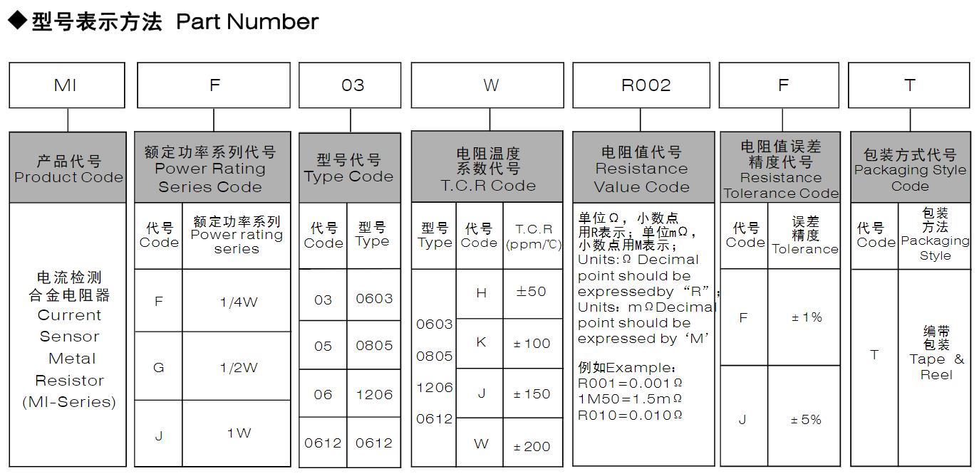 風(fēng)華高科電流檢測合金電阻器(MI系列)型號命名規(guī)則:
