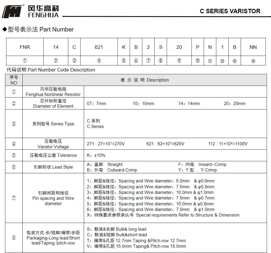風(fēng)華高科C系列壓敏電阻器型號命名規(guī)則: