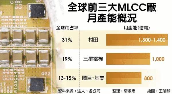 初估大發(fā)新廠滿載稼動(dòng)之下,兼并估計(jì)基美的MLCC產(chǎn)能,新國(guó)巨MLCC月產(chǎn)能可望站穩(wěn)1,000億顆,僅越日商村田(Murata)、韓商三星電機(jī)(SEMCO),穩(wěn)居寰球第三大廠。